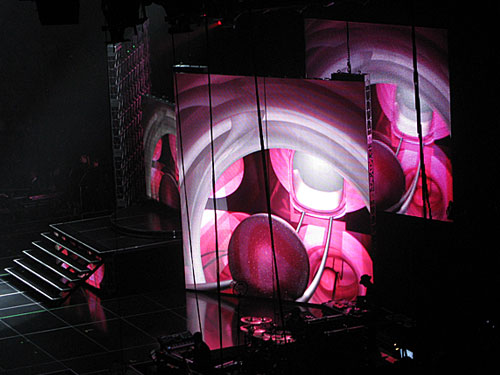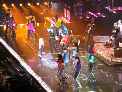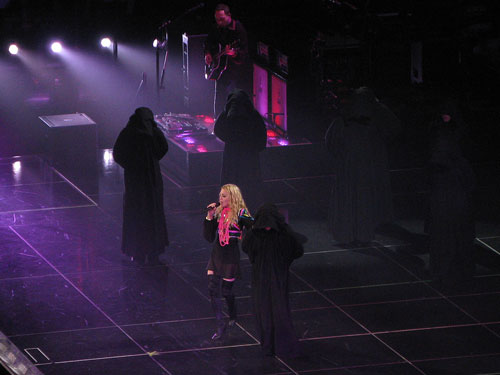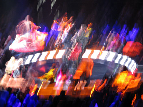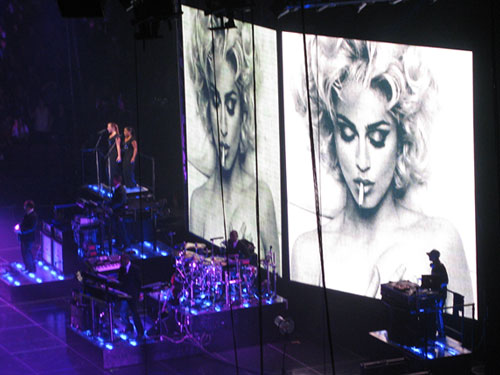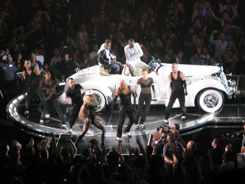 Madonna jest w fantastycznej w formie. Śpiewa, gra na gitarze, skacze, tańczy z energią nie mniejszą niż zawodowi tancerze z jej grupy, jednym slowem – daje super performance. Cały koncert były podzielona na kilka powiązanych tematycznie części – najpierw muzyka z najnowszej płyty „Hard Candy”, potem trochę klasyki, czyli stara dobra Madonna z lat 80-tych i 90-tych, następnie segment międzynarodowy – flamenco oraz motywy bliskowschodnie i cygańskie z według mnie fantastycznym wykonaniem La Isla Bonita przy akompaniamencie skrzypiec i akordeonu w wykonaniu rosyjskiego tria Saszy Kołpakova. A później część z lekka polityczna z filmowo-muzycznym montażem na temat wydarzeń na świecie – migające na ekranie fotografie polityków i znanych postaci (Al Gore, Dalai Lama, Bono, Obama, McCain).