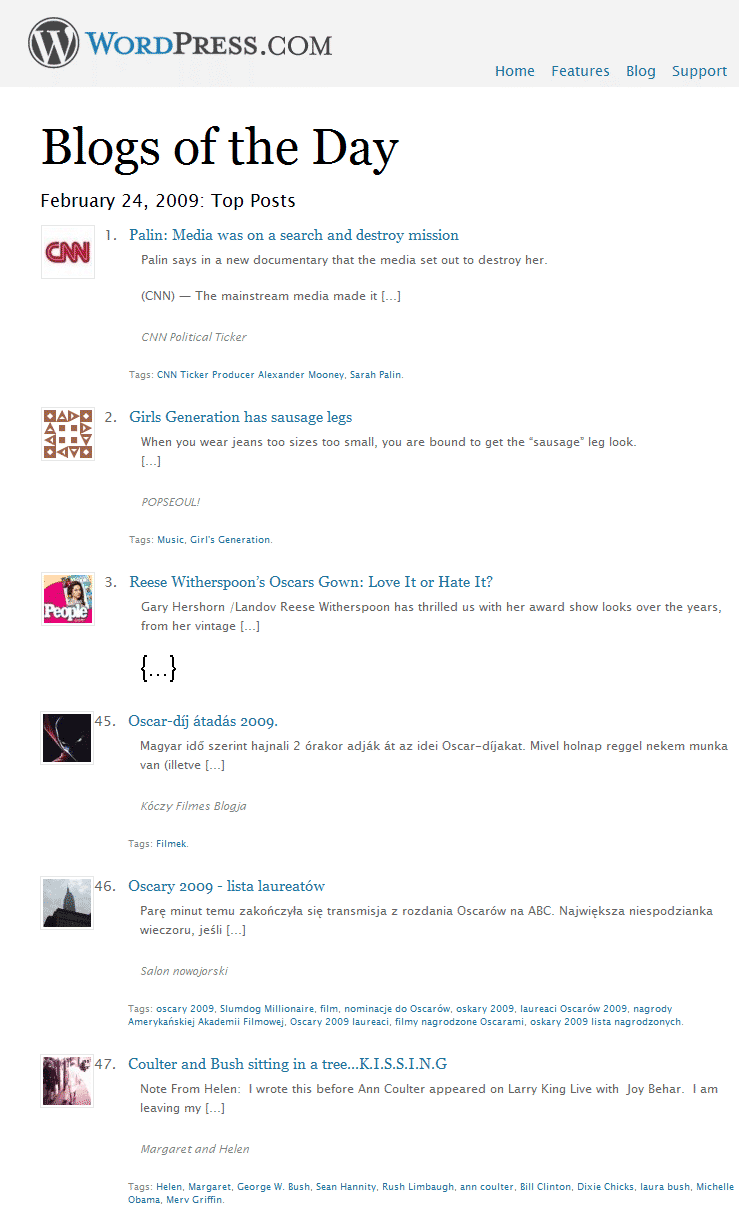 Czas na bezwstydną samopromocję – dzisiaj niniejszy blog trafił na listę Top 100 światowego WordPressa. Dokładnie tak, proszę Państwa, mówimy nie o polskim WordPressie, ale o światowym – Salon nowojorski był dzisiaj na 46. miejscu. Na pierwszym miejscu znalazł się Political Ticker CNN z tekstem na temat rzekomego spisku mediów skierowanego przeciwko Sarze Palin, na drugim – Popseoul piszący o szkodach płynących z noszenia zbyt obcisłych dżinsów, a na trzecim – People.com z wpisem na temat oscarowej kreacji Reese Witherspoon, tak więc towarzystwo doborowe 😉